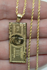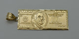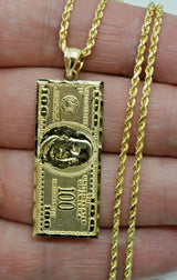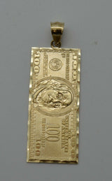 Real 10K Yellow Gold Diamond Cut One Hundred Dollar Bill Pendant + Chain 16"-24"