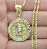Real 10K Yellow Gold Round CZ Jesus Head Pendant 4.5gr + Chain 16"-24"