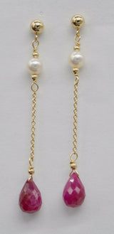 #BE-148 New 14K Solid Gold Natural Ruby with Cultured Pearl Long Drop Earrings