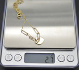 This Real 14K Yellow Gold 16/18" Heart Charm Paperclip & Cable Chain Necklace is crafted with genuine 14K yellow gold, creating a sophisticated and luxurious accessory. The design features a paperclip and cable chain, with a charming heart-shaped charm at the center. Adding a subtle shimmer, this necklace is sure to dazzle. At 2.7 gr, this necklace is lightweight and comfortable to wear.