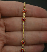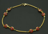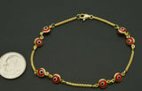 14K Yellow Solid Gold 7" Red Color Evil Eye Bracelet 2.4gr