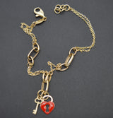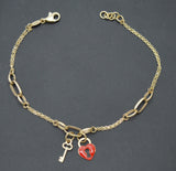 Real 14K Yellow Solid Gold 7.5" Red Enamel Charm Love Key & Heart Lock Bracelet