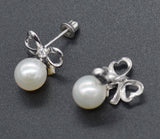 14K Solid White Gold 13mm Bow/Pearl White Cubic Zirconia Drop Earrings (JM015)