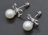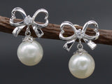14K Solid White Gold 13mm Bow/Pearl White Cubic Zirconia(CZ) Drop Earrings