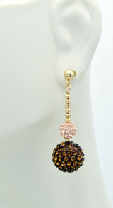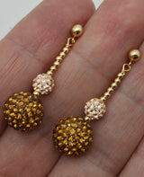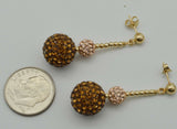 14k solid Yellow Gold 12mm& 6mm Champaign pink Crystal Pave Ball Drop Earrings