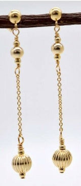 • 14K Solid Yellow Gold Corrugated Round Bead Drop/Dangle Earrings