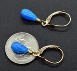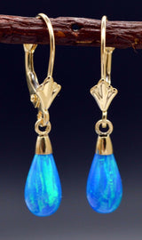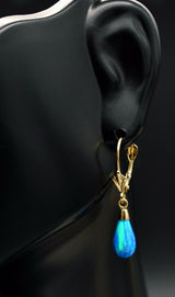 14K Solid Yellow Gold Tear Drop Blue Fire Opal Leverback Dangle Earrings