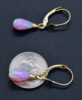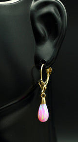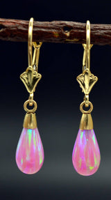 14K Solid Yellow Gold Tear Drop Pink Fire Opal Leverback Dangle Earrings