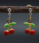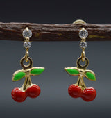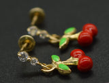 Enamel Cherries 14K Solid Yellow Gold Dangle CZ Screw-back Earrings