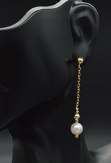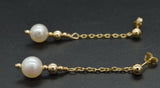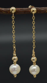 New 14K solid gold cultured white pearl dangle earrings These earrings sway with playful movement and shine. High Polished 14K Solid Gold 4mm ball. Total Hanging Length of Earring from top to bottom is 1.3/4 inches.