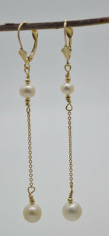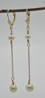 New 14K solid gold cultured white pearl dangle earrings These earrings sway with playful movement and shine. High Polished 14K Solid Gold 2mm ball. Total Hanging Length of Earring from top to bottom is 2.5 inches.