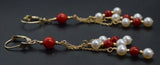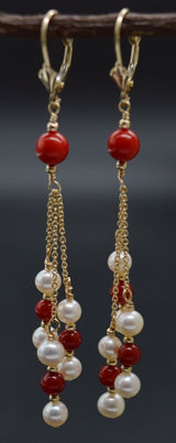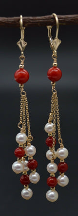 New 14K Solid Gold Natural Coral & Pearl Chandelier Leverback Earrings