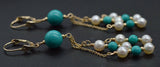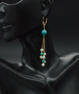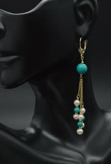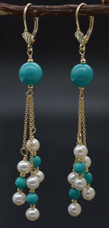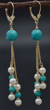 14K Solid Gold Natural Turquoise & Pearl Chandelier Leverback Earrings