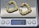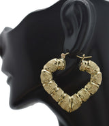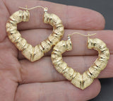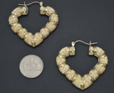 Real 10K Yellow Gold Diamond Cut Heart Bamboo 4.9gr Hoop Earrings