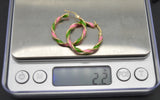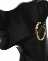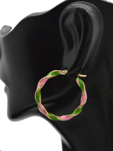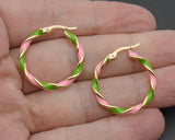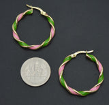 Real 14K Yellow Gold 25.8mmx3mm Green+Pink Enamel Twist Hoop Earrings