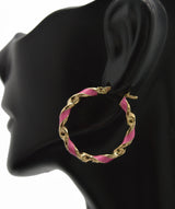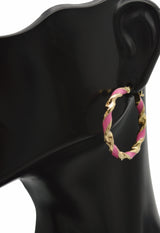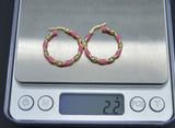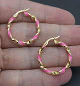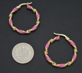 Real 14K Yellow Gold 25.8mmx3mm Pink Enamel Round Twist Hoop Earrings 2.2grams