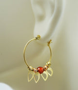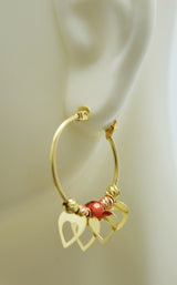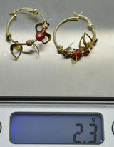 Real 14K Yellow Gold Hoop Dangling Movable Heart Red Bead Earrings 27.5mm